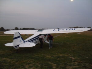 Estuvimos en el Aero Club Mercedes ultimando los detalles para el vuelo. El avión es un Piper pa-11 con motor Continental de 65 hp y velocidad crucero de 110m/h.