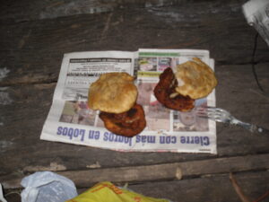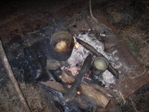 Antes de que baje el sol armamos la carpa y preparamos la cena. Habíamos conseguido un kilo de grasa de cerdo y una lata grande para hacer tortas fritas. Pusimos un poco de sal a un engrudo de agua y harina y mientras se calentaba la grasa en el fuego hervíamos agua en otro recipiente para guardar para la noche y el desayuno. A la mañana siguiente no habría tiempo de encender el fuego.