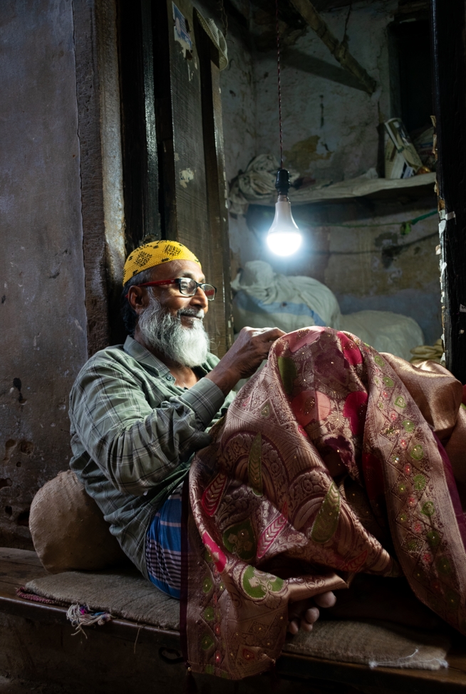 Visitamos muchos negocios de tejidos, perfumes, aceites y piedras. Pintu, oriundo de Varanasi y muy piola, conocía bien todos los lugares y adonde convenía ir. En las callejuelas pasaba todo. En la India en general no es fácil tener una vivienda, y mucho menos una grande. Mucha gente tiene una ventana y un espacio de unos 2×1,5 y por eso pasa gran parte del día en la ventana o la calle. Este señor por ejemplo se dedica a surcir mantas de alta calidad tejidas a mano. Lo que se ve atrás es su casa. No tiene teléfono, ni agua y lo que hay en una repisa es la comida que tiene, que si la mirás dos veces te la ofrece.