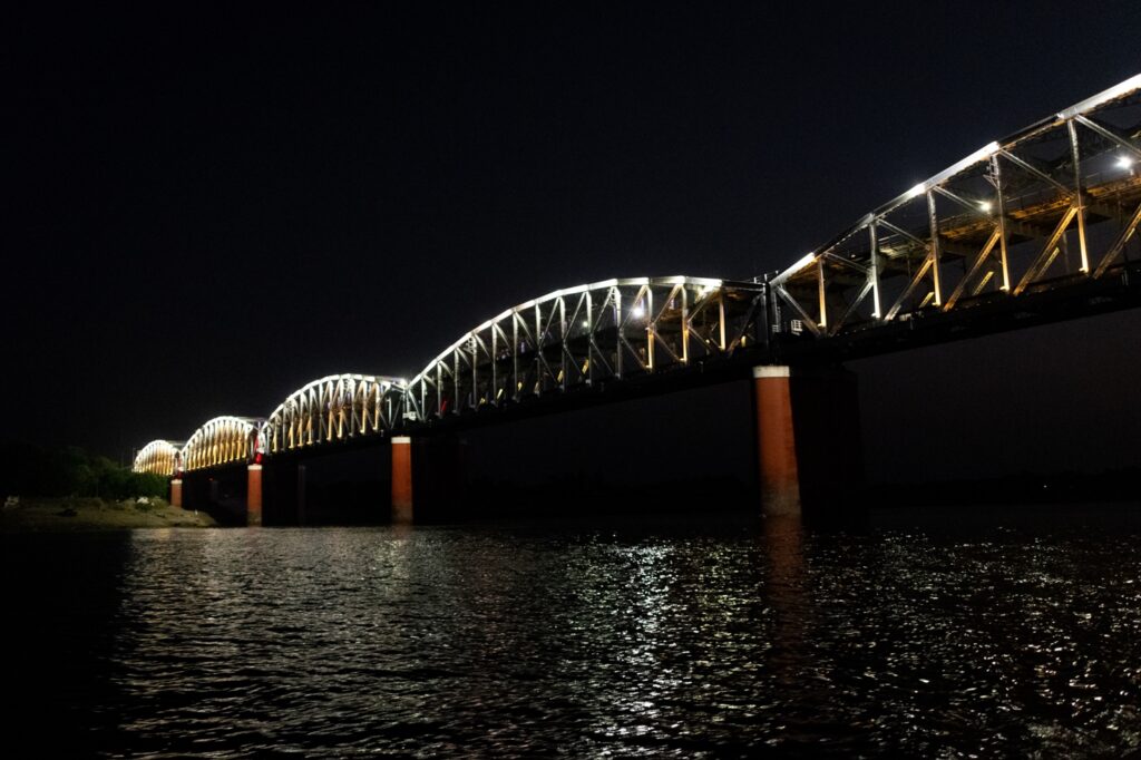 El paseo por el río no es barato, pero los españoles quieren hacerlo a toda costa. Nos embarcamos en un bote para recorrer desde el agua todos los Ghats y llegar al impresionante puente que construyeron los ingleses aguas arriba de la ciudad.